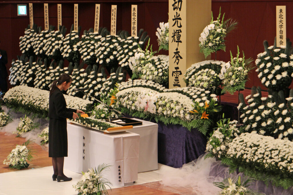 続けて、石井 直人東北大学医学部長より祭文が告げられました。「近代科学技術の発展に伴い難病に対する治療法は急速に発展していますが、なお多くの難病があり、今も多くの患者さんが苦しんでおられます。人命を守り、心身の健康を支えることは、医療に携わる者の使命であり、私どもは優れた後継者の育成と学術のさらなる発展に努め続けなければなりません。ご遺族の深いご理解と関係各位のご協力のもと私どもがお預かりしたご遺体は、この社会的付託にお応えするうえで極めて貴重な存在であります」と述べました。その後、東北大学歯学部の学生代表および白菊会理事長より慰霊のことばが捧げられ、ご遺族代表、来賓、白菊会代表、学部長、教員代表、学生代表による献花が行われました。式典の最後には、張替 秀郎東北大学病院長より「故人様はもとより、ご遺族様の尊い篤志は、今後の医学・歯学のさらなる発展のために何ものにも代え難い偉大なる貢献を果たされました。皆様の崇高なる御心に、重ねまして深い感謝の意を表します」と御礼の言葉が述べられ、慰霊祭は終了しました。
